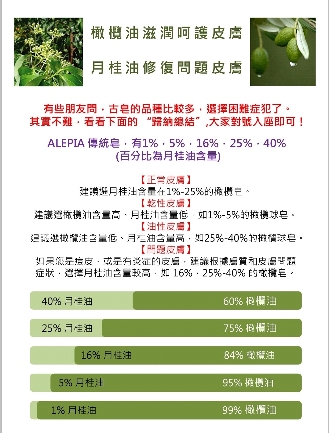 ► 普通皮膚或有輕微肌膚問題的時候,建議選用 5% 或 16% 月桂成份的阿勒頗古皂-調高橄欖比例,親膚潤澤,同時具備月桂功效,以天然成份慢慢調理皮膚健康,有助預防敏感和肌膚問題復發。