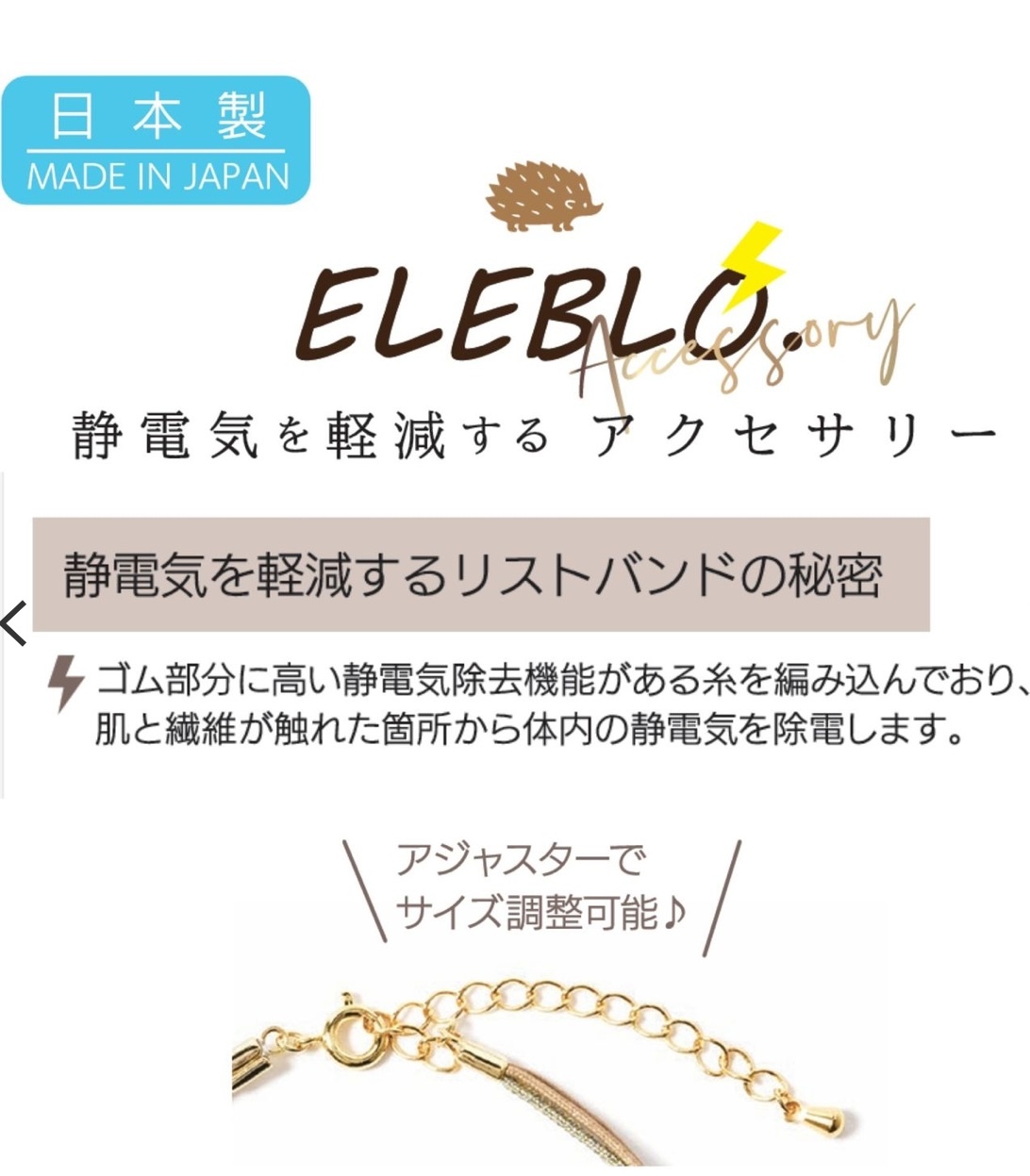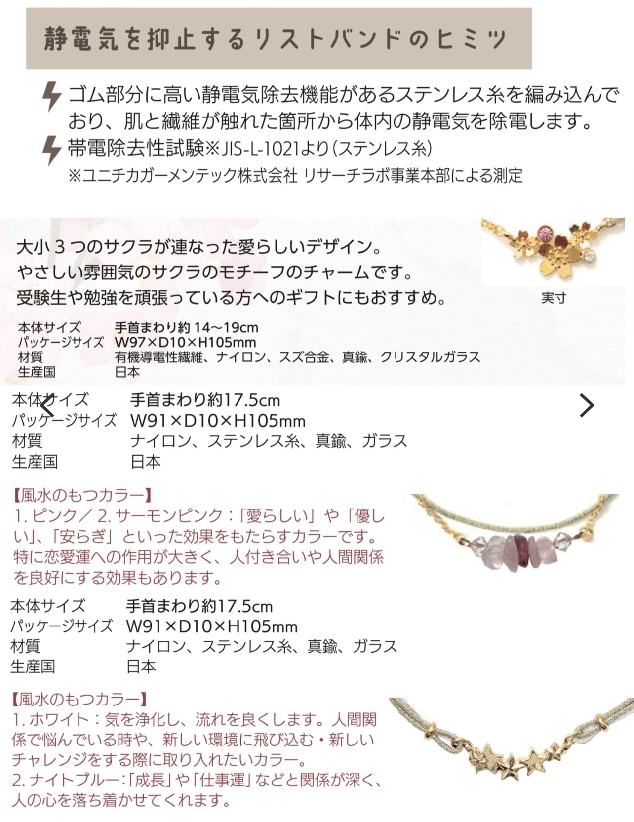 皮膚比較乾燥,、以及秋冬長衫比較多靜電、來購買這款抑制靜電的手鍊吧除了抑制靜電、亦能減少靜電所帶來的灰塵及花粉通過帶電除去性測試:JIS-L-1021工匠一個一個手工製作的,全部是日本製造的手工商品。單獨佩戴,與手錶或其他飾品疊加佩戴也OK。既實用又兼具設計性的手鐲。感。鍊子和閃閃發光的繩子的疊加風格,營造出纖細的手邊。原產國:日本